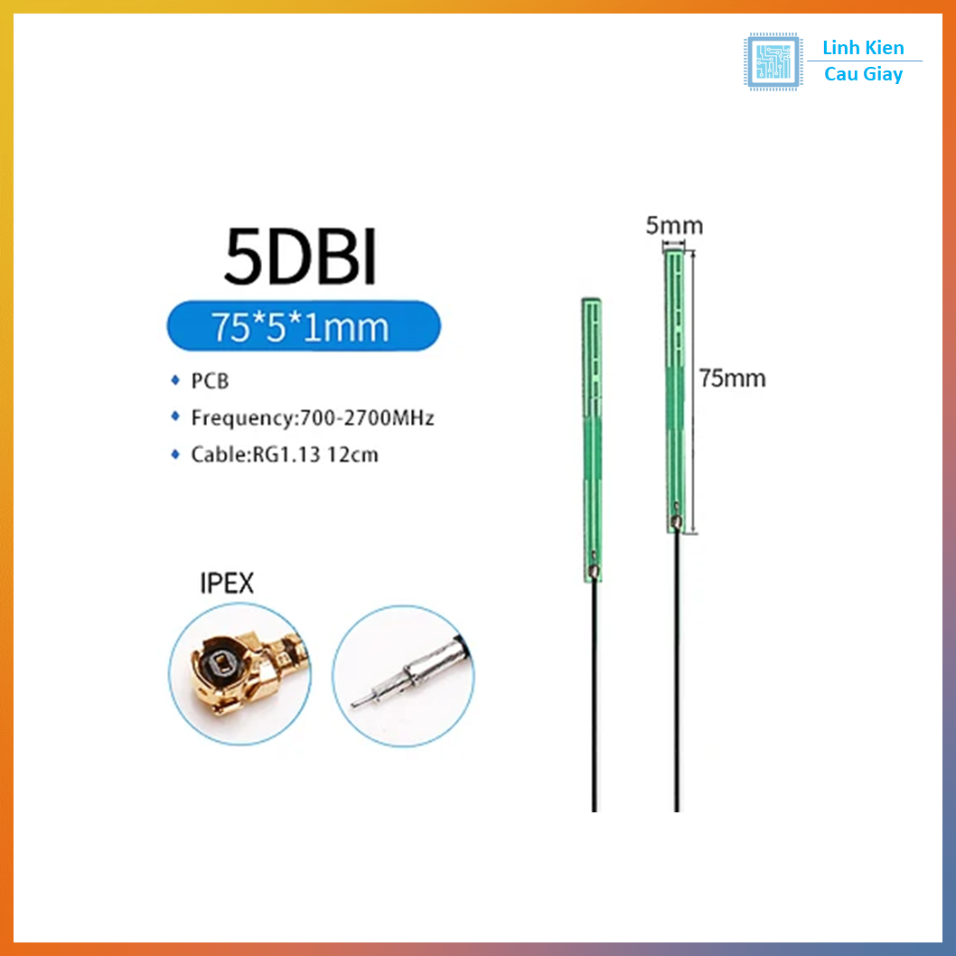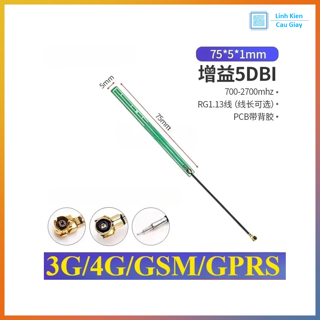 Phần anten được in trên mạch FPC/PCB mỏng giúp dễ dàng dán vào vỏ nhựa, thành hộp, mặt trong thiết bị. Đầu còn lại là dây đồng trục nhỏ (coax) để hàn trực tiếp lên bo mạch RF hoặc lên đầu nối (SMA, U.FL, IPEX…) tùy thiết kế.