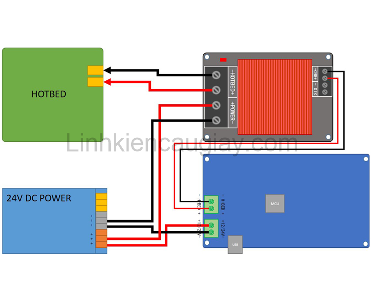 4. Kết nối các tín hiệu điều khiển của Ramps1.4 hoặc MKS MOSFET đến cực -/+ của bàn nhiệt