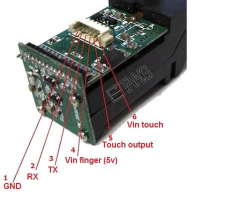 1. GND2. RX - Chân nhận dữ liệu UART3. TX - Chân phát dữ liệu UART4. Vin finger - Chân cấp nguồn để nhận diện vân tay (5v)5. Touch output - Chân tín hiệu báo có ngón tay chạm vào6. Vin touch - Chân cấp nguồn để cảm biến có ngón tay chạm vào (3-5v)