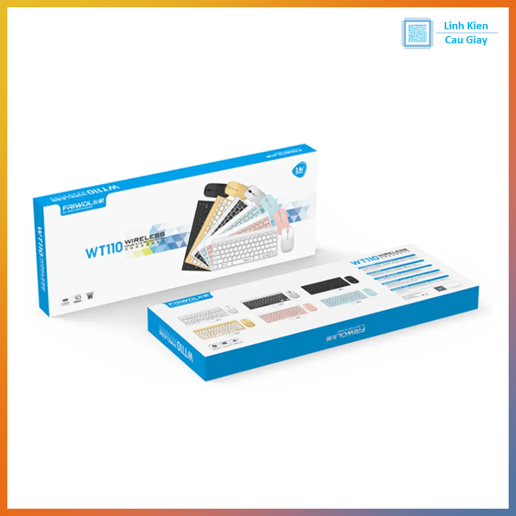 Combo bàn phím + chuột không dây WT110 là bộ phụ kiện văn phòng gọn nhẹ, kết nối qua USB Nano Receiver (2.4GHz) ổn định, dùng tốt cho PC, laptop, TV box… Thiết kế phím bấm êm, dễ gõ, chuột nhỏ gọn thao tác thoải mái. Bộ sản phẩm có chế độ tiết kiệm điện, phù hợp làm việc, học online, soạn thảo lâu dài.