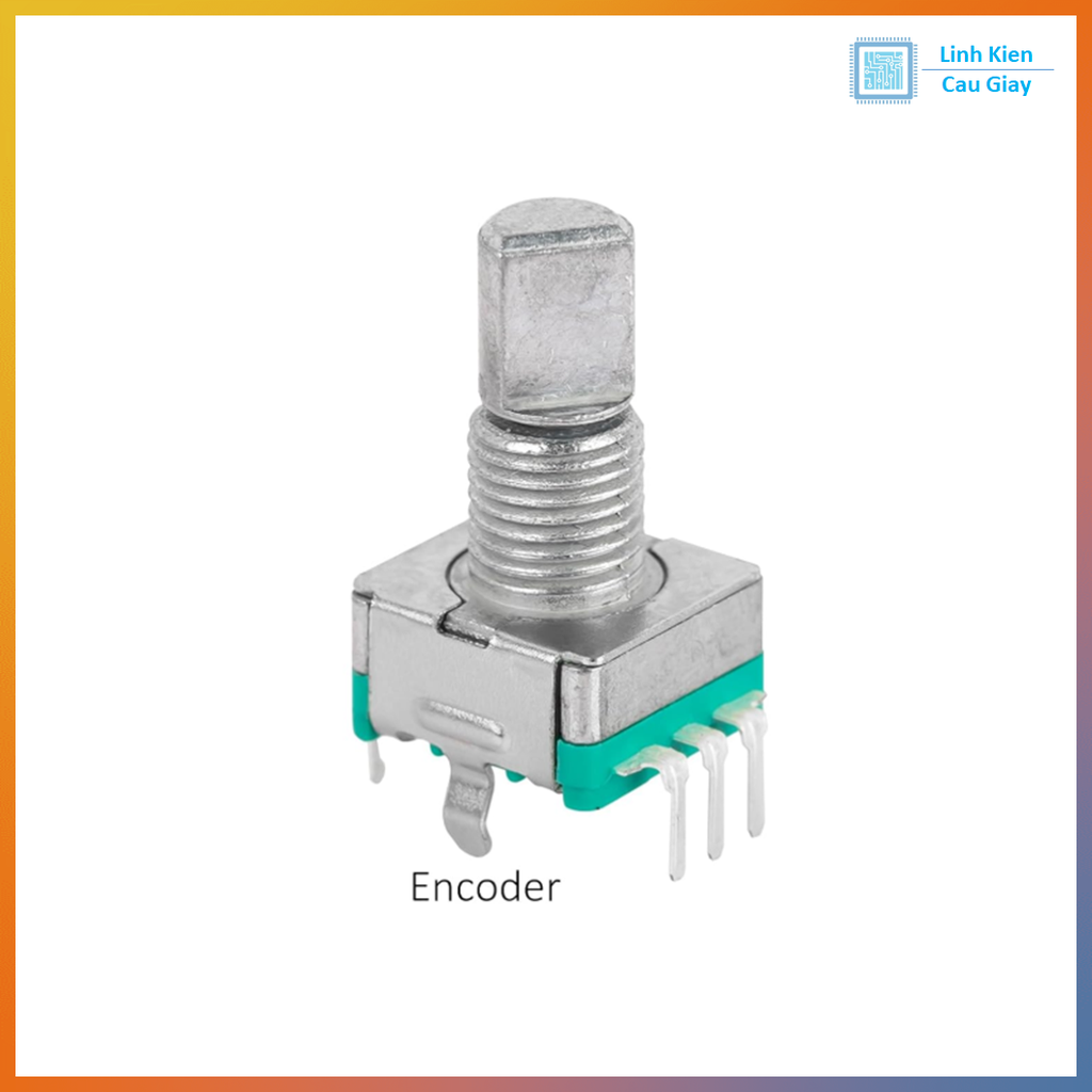 Thân encoder dạng gắn PCB, có ren và đai ốc để bắt lên panel/vỏ hộp, trục kim loại vuông/dẹt dễ gắn núm xoay. Đa số phiên bản EC11 còn tích hợp nút nhấn ở trục (nhấn – nhả) giúp tạo thêm một phím bấm trên cùng một linh kiện – rất tiện cho menu, điều chỉnh âm lượng, chọn chế độ…
