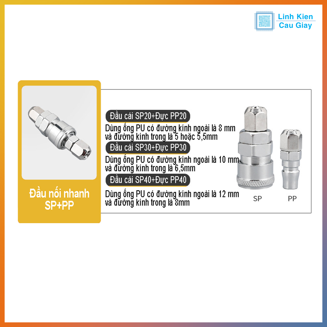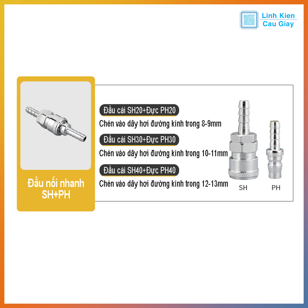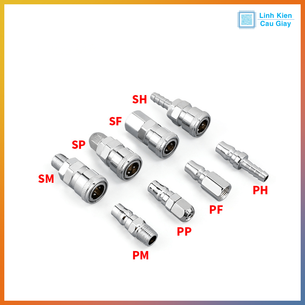 Đầu nối hơi nhanh (Quick Coupler) là phụ kiện quan trọng trong hệ thống khí nén, cho phép kết nối và ngắt nhanh đường ống khí mà không cần dụng cụ hỗ trợ. Các cặp nối nhanh SH-PH, SM-PM, SP-PP, SF-PF là các loại phổ biến, có thể kết nối với nhiều thiết bị như súng xì khí, máy nén, dây hơi,...