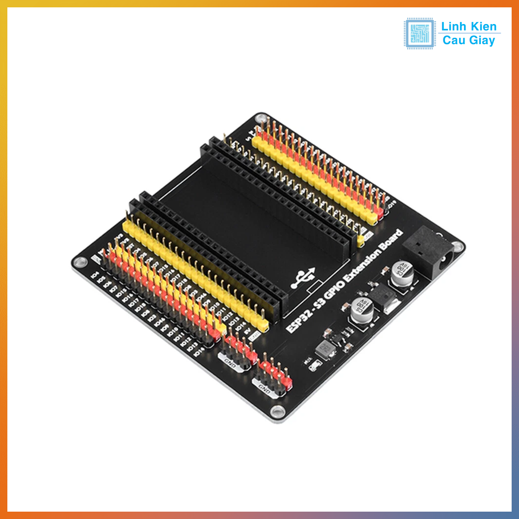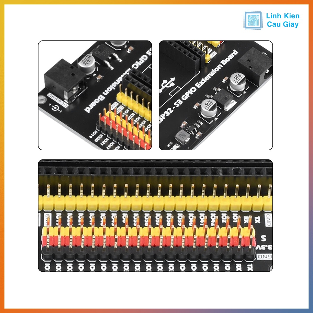 Đế ra chân ESP32-S3 GPIO Extension Board có hai hàng chân cái (female headers) tương ứng với các chân của module ESP32-S3, được đánh dấu rõ ràng trên PCB: