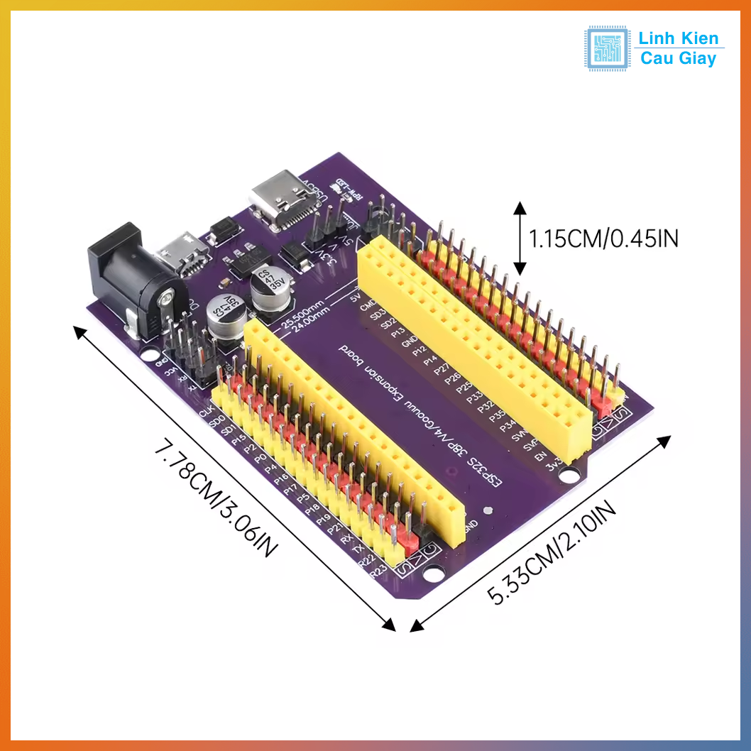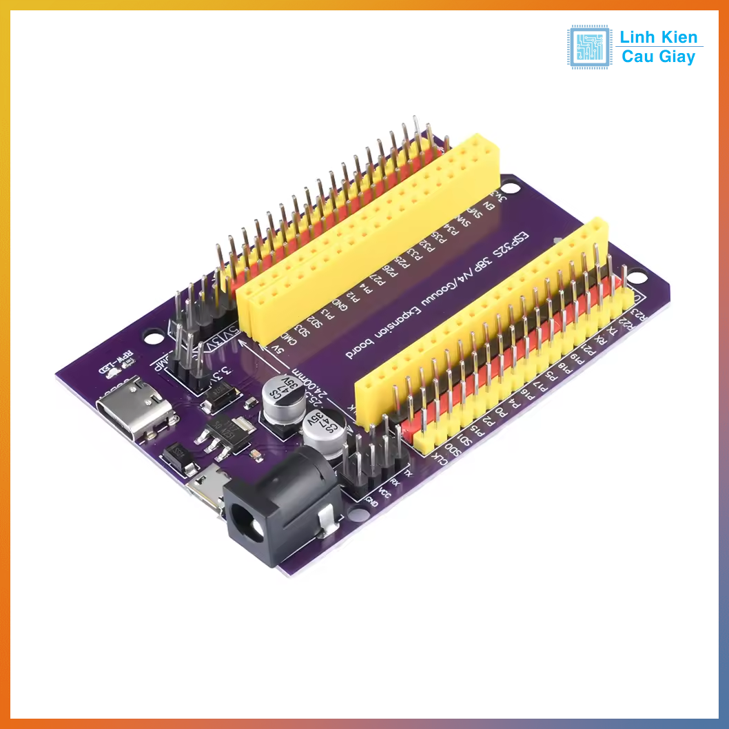 ESP32 ESP32S ESP-WROOM-32 Expansion Board là board mở rộng (backboard) được thiết kế để tương thích với các module phát triển ESP32 38 chân, bao gồm ESP32, ESP32S và ESP-WROOM-32. Board này mở rộng khả năng kết nối với các chân GPIO thông qua hai hàng chân cái (female headers) màu vàng, được đánh dấu rõ ràng, giúp dễ dàng kết nối với các thiết bị ngoại vi mà không cần hàn. Sản phẩm tích hợp cổng USB-C để cấp nguồn và lập trình, cùng với cổng nguồn DC và các thành phần hỗ trợ như tụ điện và điện trở. Với thiết kế nhỏ gọn và PCB chất lượng cao, đây là lựa chọn lý tưởng cho các dự án IoT, lập trình và phát triển phần cứng với ESP32.