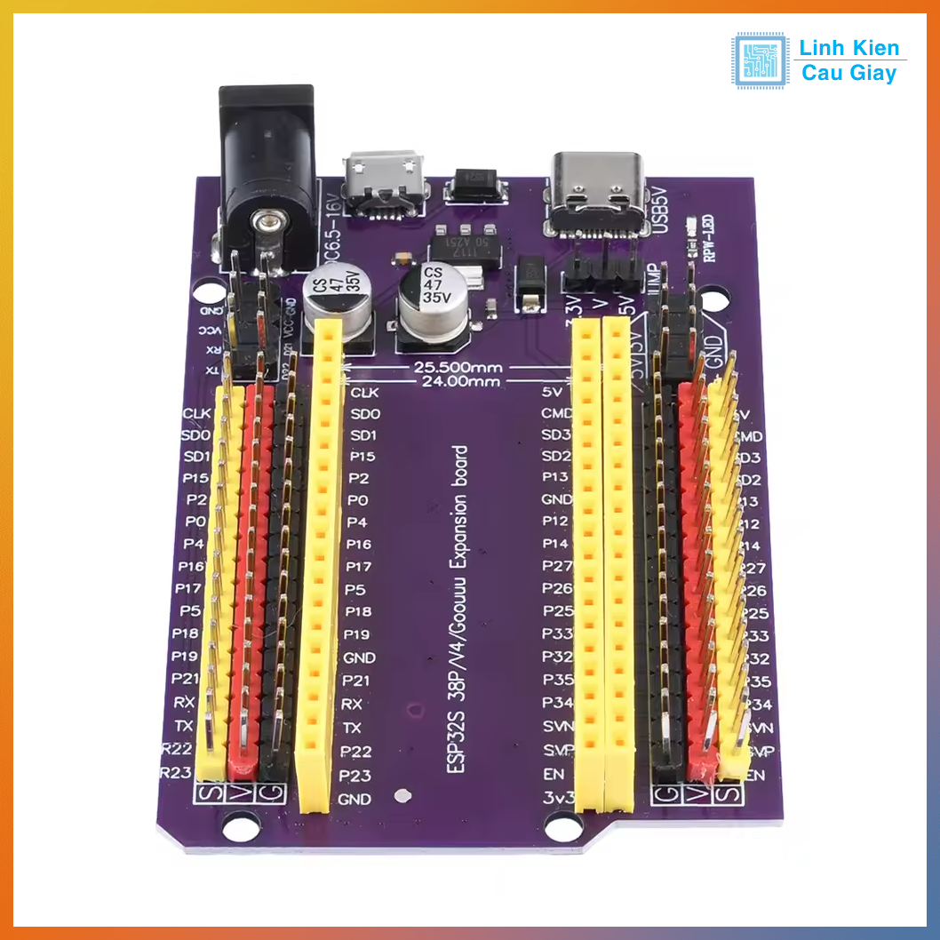 ESP32 ESP32S ESP-WROOM-32 Expansion Board có hai hàng chân cái (female headers) tương ứng với 38 chân của module ESP32, được đánh dấu rõ ràng trên PCB: