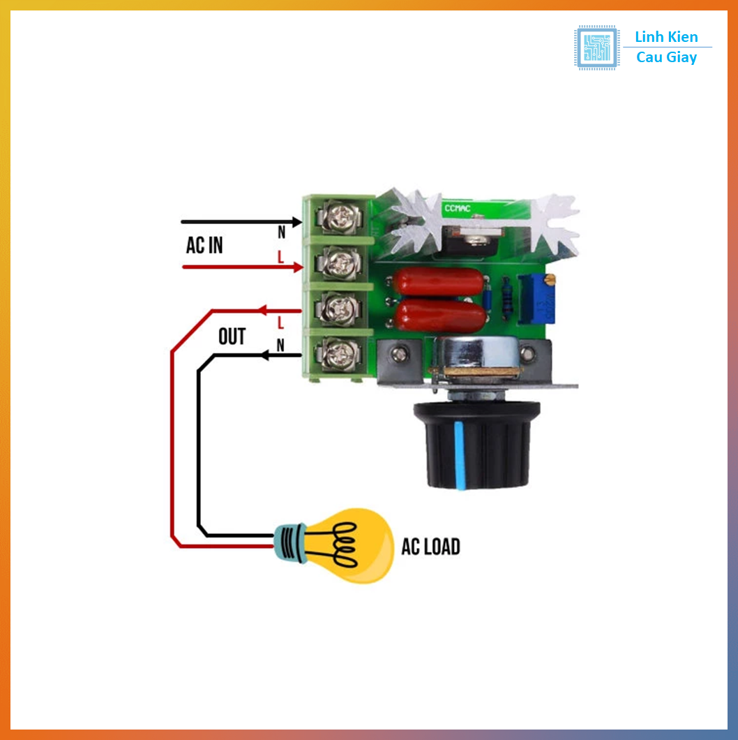 Dimmer 2000W hoạt động dựa trên nguyên lý điều khiển góc mở Triac, giúp thay đổi điện áp xoay chiều cấp cho tải.