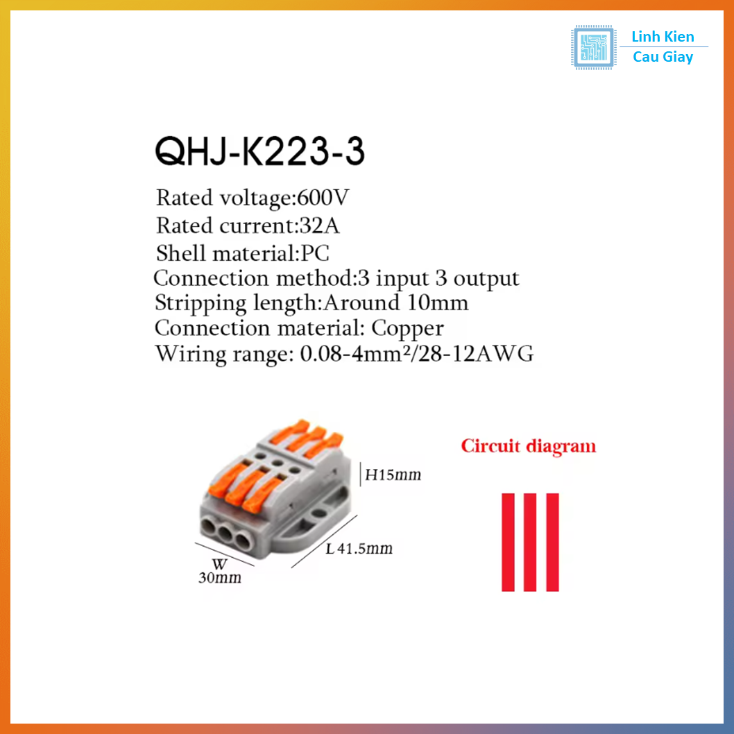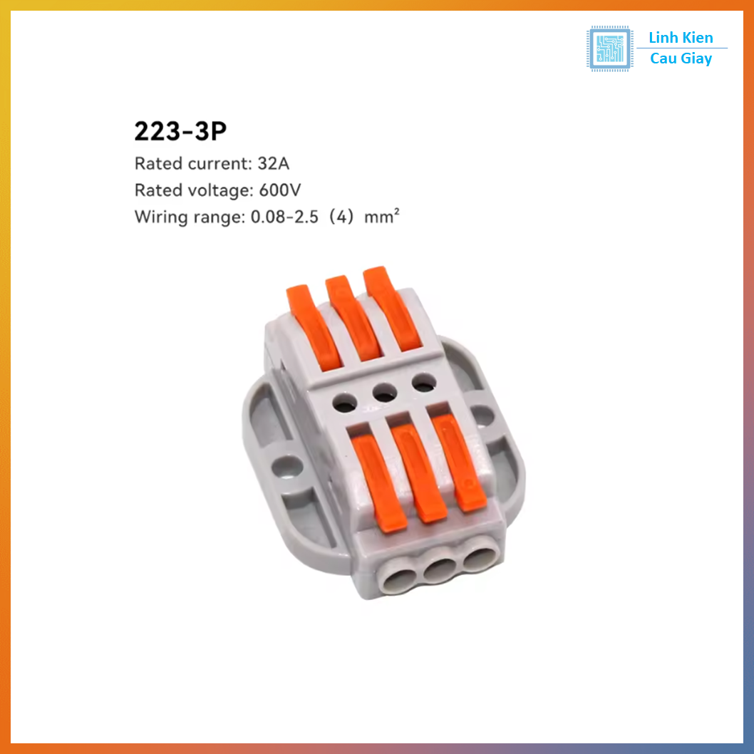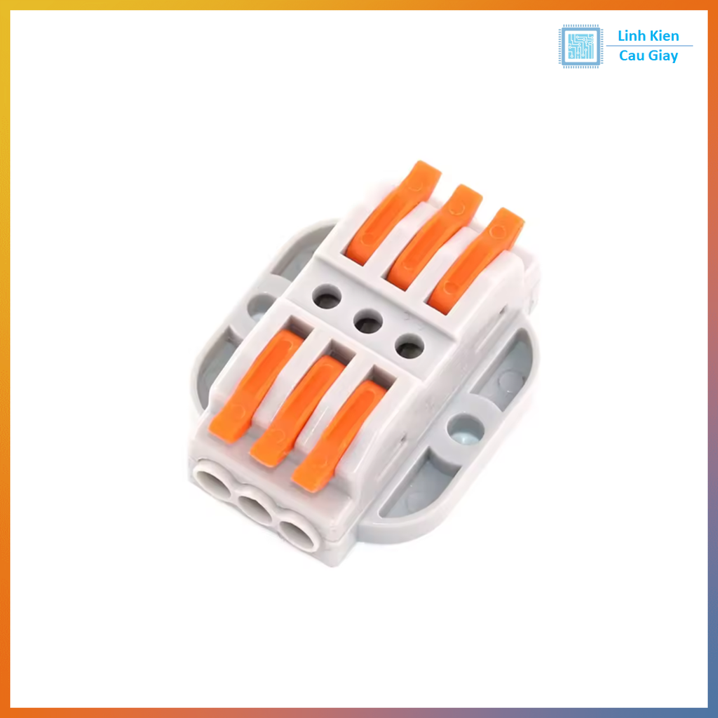 SPL-3 là đầu nối dây điện nhanh 3 chân kiểu nhấn/cần gạt giúp nối dây cực nhanh, chắc chắn mà không cần vít siết hay hàn. Chỉ cần gạt cần cam màu cam để mở kẹp, đưa dây vào rồi gạt xuống là hoàn tất. Bản có tai bắt ốc (lỗ bắt vít M3) giúp cố định chắc lên bề mặt/hộp điện, gọn dây, hạn chế rung lắc. Phù hợp cho đèn LED, điện dân dụng, hộp nối, tủ điện mini, DIY điện – điện tử, sửa chữa và bảo trì.