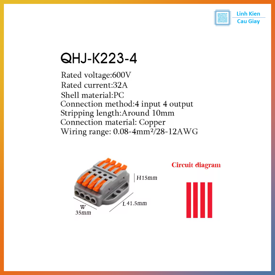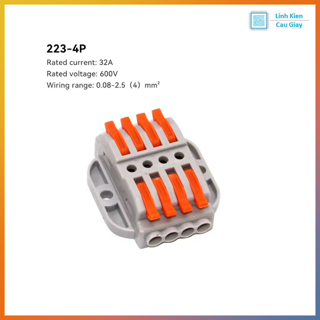 SPL-4 là đầu nối dây điện nhanh 4 chân kiểu nhấn/cần gạt giúp nối dây cực nhanh, chắc chắn mà không cần vít siết hay hàn. Chỉ cần gạt cần cam màu cam để mở kẹp, đưa dây vào rồi gạt xuống là hoàn tất. Bản có tai bắt ốc (lỗ bắt vít M3) giúp cố định chắc lên bề mặt/hộp điện, gọn dây, hạn chế rung lắc. Phù hợp cho đèn LED, điện dân dụng, hộp nối, tủ điện mini, DIY điện – điện tử, sửa chữa và bảo trì.