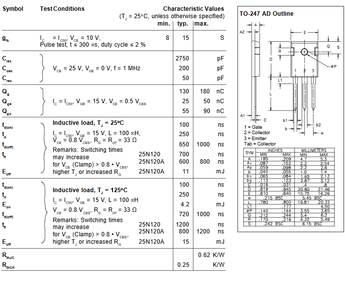 Lưu ý: cùng tên “25N120” nhưng có nhiều hãng/phiên bản → nên đối chiếu đúng mã in trên thân linh kiện/datasheet khi thay thế.