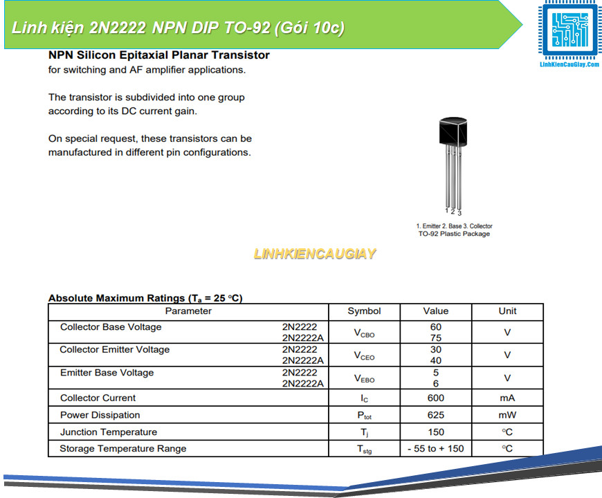 Linh kiện 2N2222 NPN DIP TO-92 (Gói 10c)