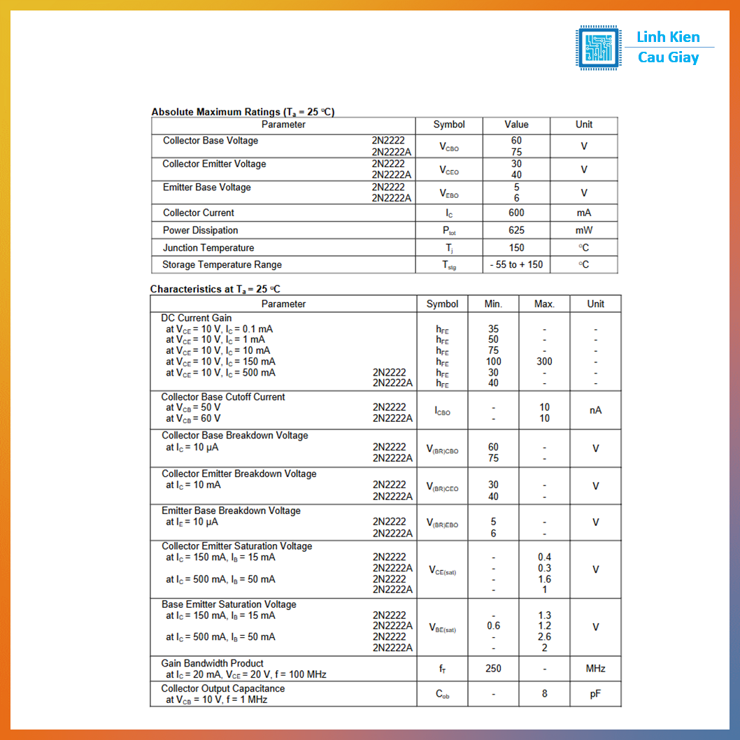 VCEo: khoảng 30–40V (tùy phiên bản 2N2222/MMBT2222A)