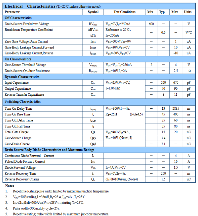 4N60 là MOSFET kênh N “cao áp”, thường dùng làm khóa công suất trong các mạch chuyển mạch tốc độ cao; nhiều hãng sản xuất nên một số thông số (RDS(on), Qg…) có thể chênh nhẹ theo lô