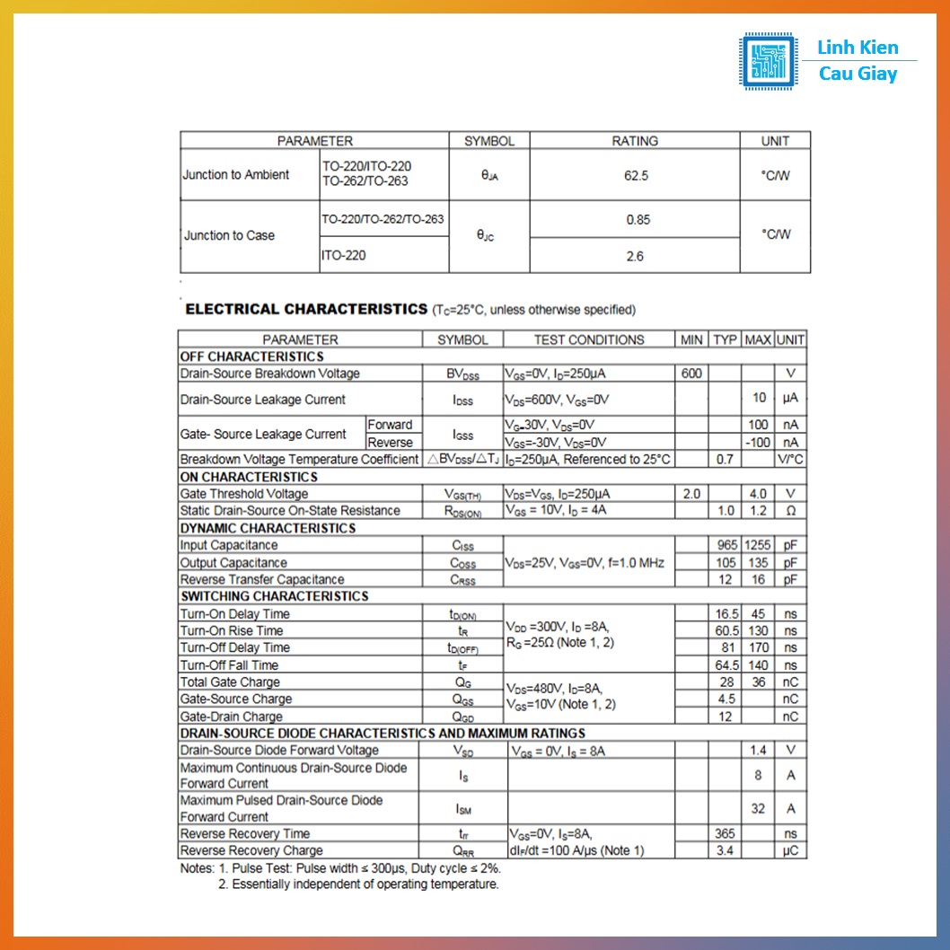 #8N60 #MOSFET8N60 #MOSFETTO220 #MOSFET600V #MOSFETNkênh #LinhKiệnĐiệnTử #LinhKiệnNguồnXung #SửaChữaNguồn #NguồnXungSMPS #TransistorCôngSuất #TO220 #ĐiệnTửDIY #LinhKiệnCầuGiấy #LKCGVN