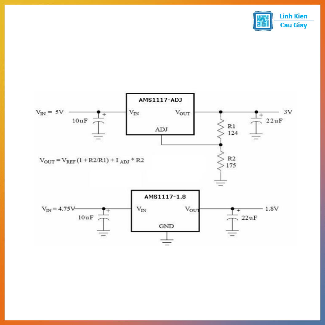 AMS1117-ADJ là IC LDO tuyến tính có điện áp tham chiếu Vref ~ 1.25V, cho phép đặt Vout bằng 2 điện trở chia áp (R1, R2). Ưu điểm là mạch đơn giản, điện áp ra “sạch”, phù hợp làm nguồn cho mạch số/analog. Lưu ý IC tuyến tính sẽ tỏa nhiệt khi chênh áp (Vin − Vout) lớn và dòng tải cao.
