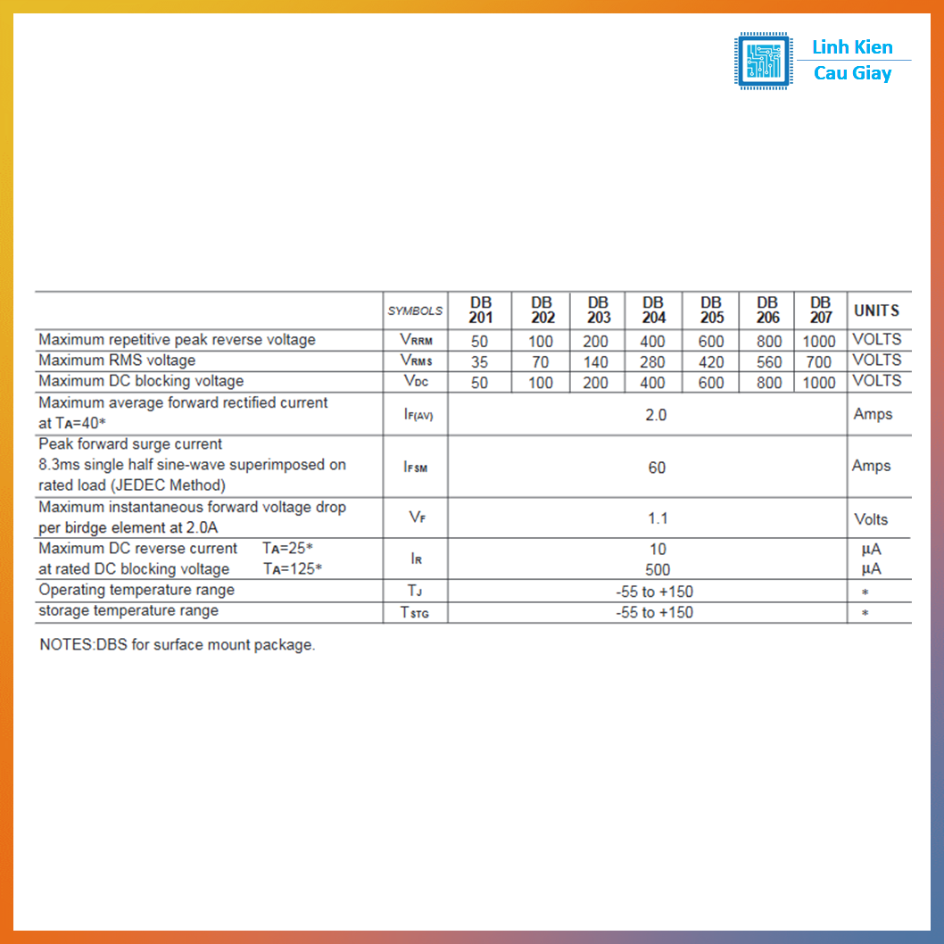 Dòng chỉnh lưu: thường khoảng 1A (phổ biến với dòng DB1xx)