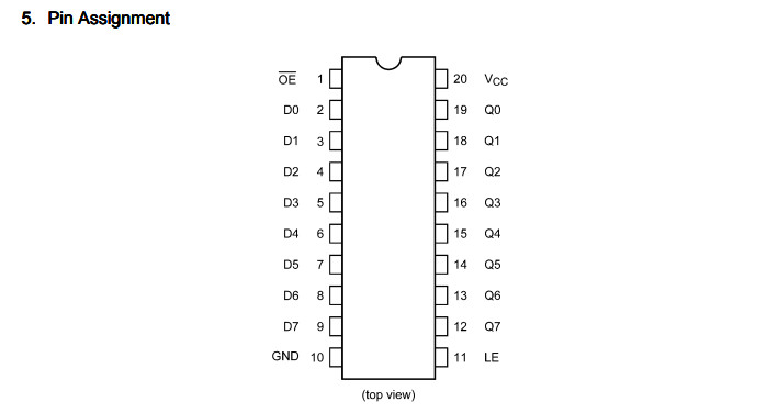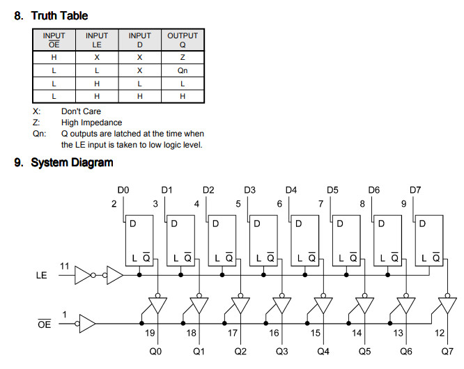 Nguyên lý hoạt động của IC 74HC573: Cho dữ liệu vào 8 chân đầu vào từ D0 -> D7 khi chân chốt LE chưa hoạt động hay ở mức thấp thì trạng thái đầu ra chưa thay đổi. Khi chân LE lên mức cao thì dữ liệu đầu ra Q0 -> Q7 sẽ ứng dữ liệu đầu vào tại thời điểm chốt (tạo ra 1 xung). Sau thời điểm chốt dữ liệu đầu ra sẽ không thay đổi khi dữ liệu đầu vào có thay đổi như thế nào đi nữa. Tức là chỉ khi chân chốt LE hoạt động thì dữ liệu đầu ra sẽ thay đổi theo dữ liệu đầu vào tại thời điểm ấy. Còn khi LE không hoạt động thì dữ liệu đầu ra sẽ mãi ở trạng thái đó dù đầu vào thay đổi.