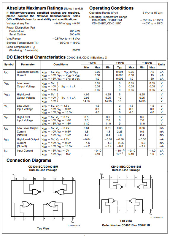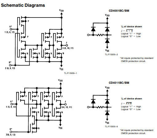 Cấu tạo bên trong IC CD4011BCN có bốn cổng logic NAND, mỗi cổng có 2 ngõ vào và 1 ngõ ra. Điện áp cung cấp để IC có thể hoạt động được nhỏ nhất là 3V và lớn nhất là 15V. Dòng điện ra ở mỗi ngõ ra có thể lên đến 10mA.