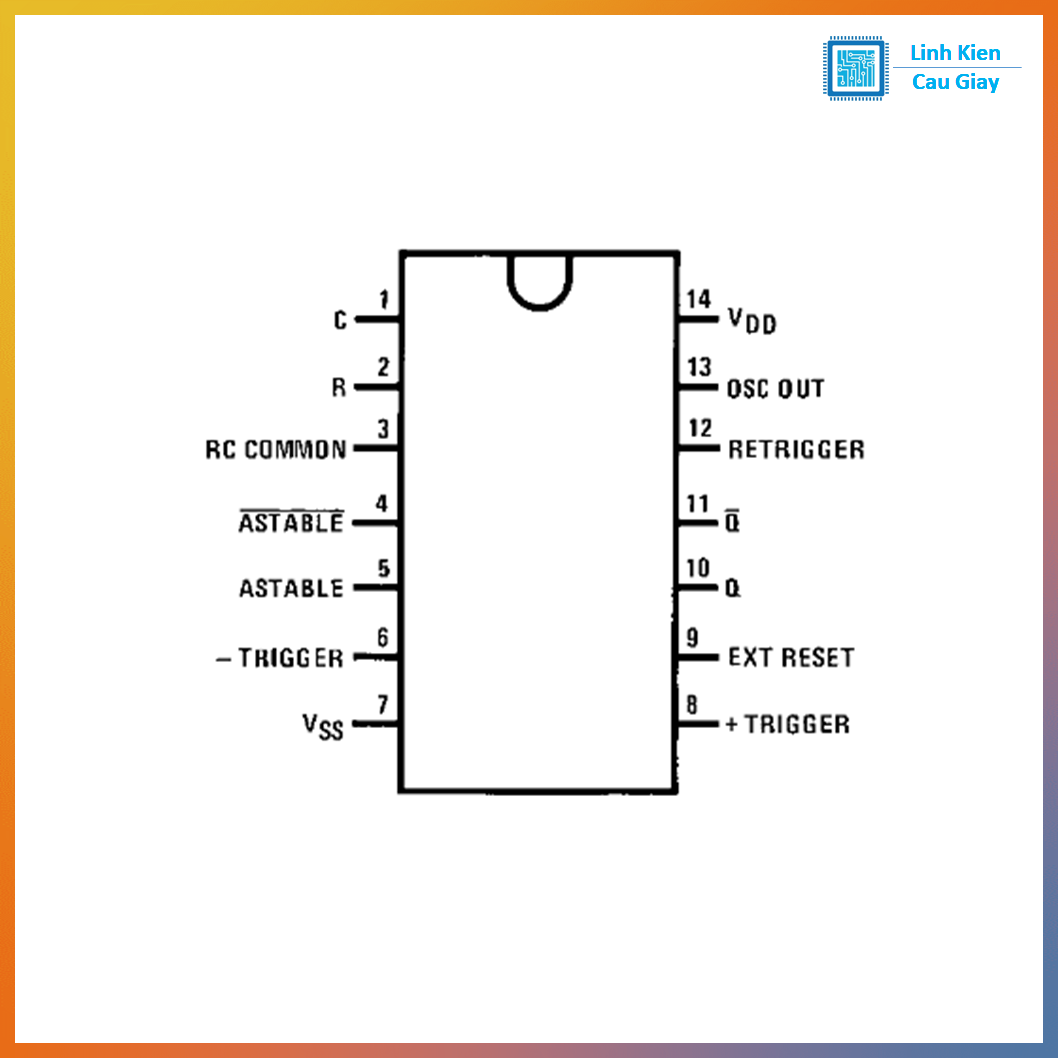 Ngõ ra: 2 ngõ Q và /Q đối pha 180°, duty cycle gần 50% ở chế độ astable