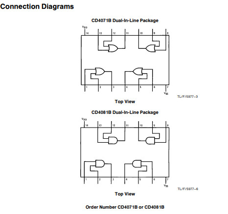 Các cổng quad CD4071 là IC nguyên khối mạch tích hợp MOS (CMOS) bổ sung được xây dựng với các bóng bán dẫn chế độ tăng cường kênh N và P. Chúng có nguồn bằng nhau và dòng chìm khả năng và phù hợp với ra series B tiêu chuẩn. Tất cả các đầu vào được bảo vệ chống phóng tĩnh với điốt VDD và VSS.