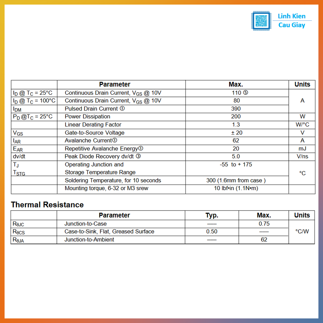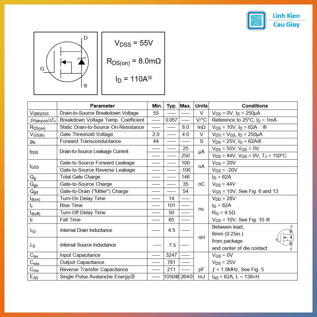 • Dòng Drain liên tục (ID): 110A @TC=25°C, VGS=10V (thực tế phụ thuộc tản nhiệt; datasheet có lưu ý giới hạn theo package ~75A)