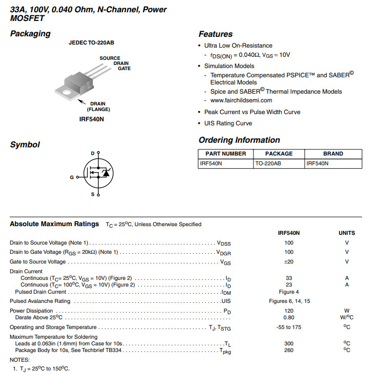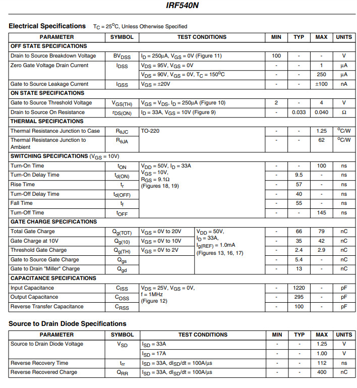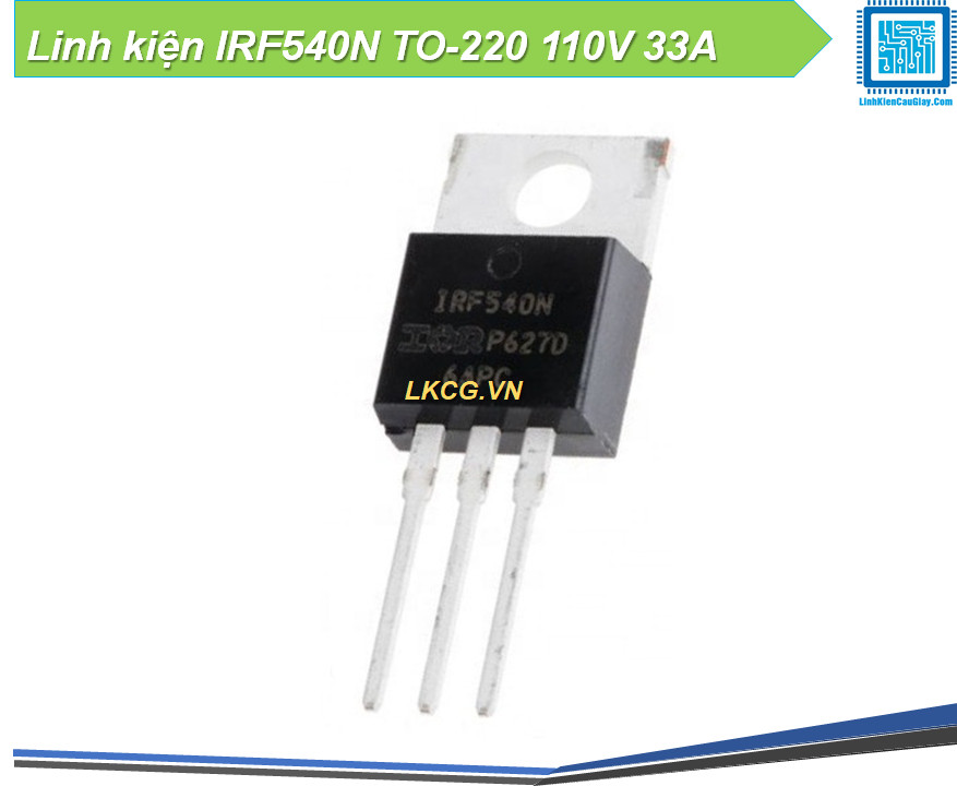 - Dòng điện cực đại mosfet IRF540N: ID = 33A