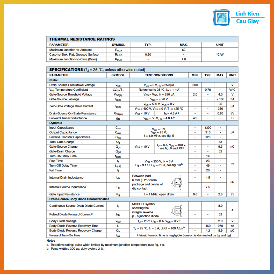 ID (Dòng Drain liên tục): khoảng 8A (tùy hãng/điều kiện tản nhiệt)