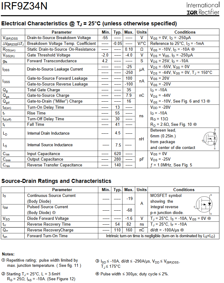VDS (Drain-Source): khoảng -55V (thường gặp ở họ IRF9Zxx, tùy hãng/phiên bản)