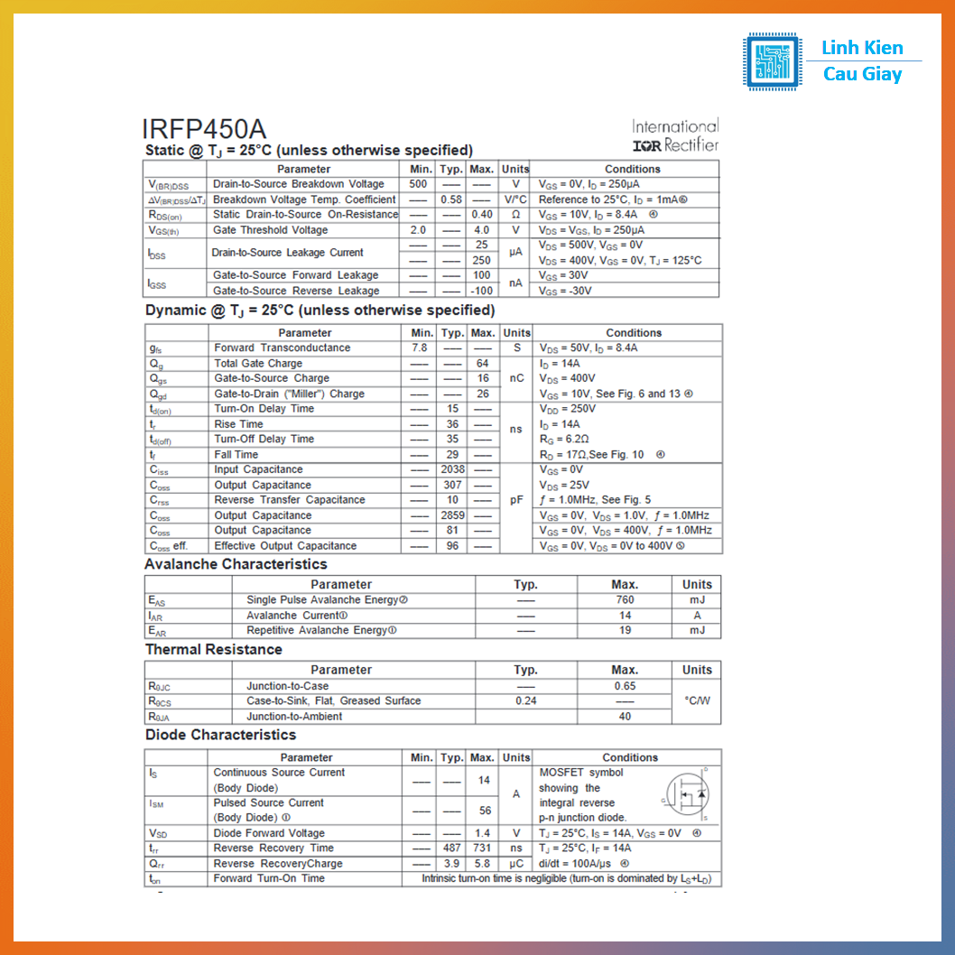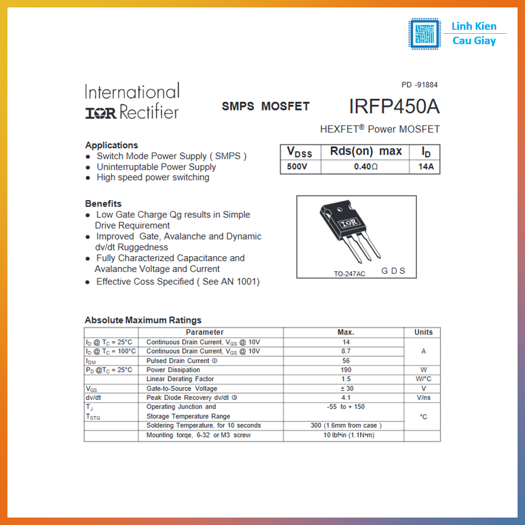 #IRFP450A #MOSFETCôngSuất #MOSFETNKhênh #MOSFET500V #MOSFETTO247 #LinhKiệnĐiệnTử #LinhKiệnNguồnXung #SửaChữaNguồn #NguồnXungSMPS #Inverter #UPS #ĐiệnTửDIY #LinhKiệnCầuGiấy #LKCGVN