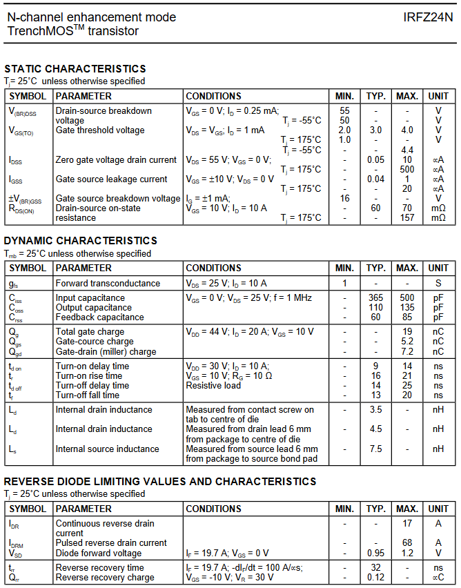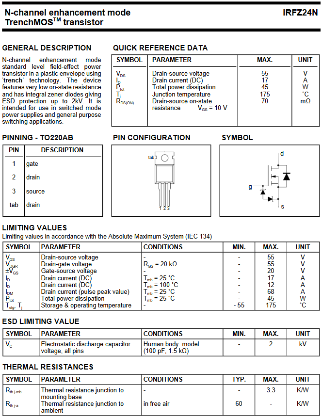 VDS (Drain-Source): khoảng 55V (thường gặp ở họ IRFZxx, tùy phiên bản/nhà sản xuất)