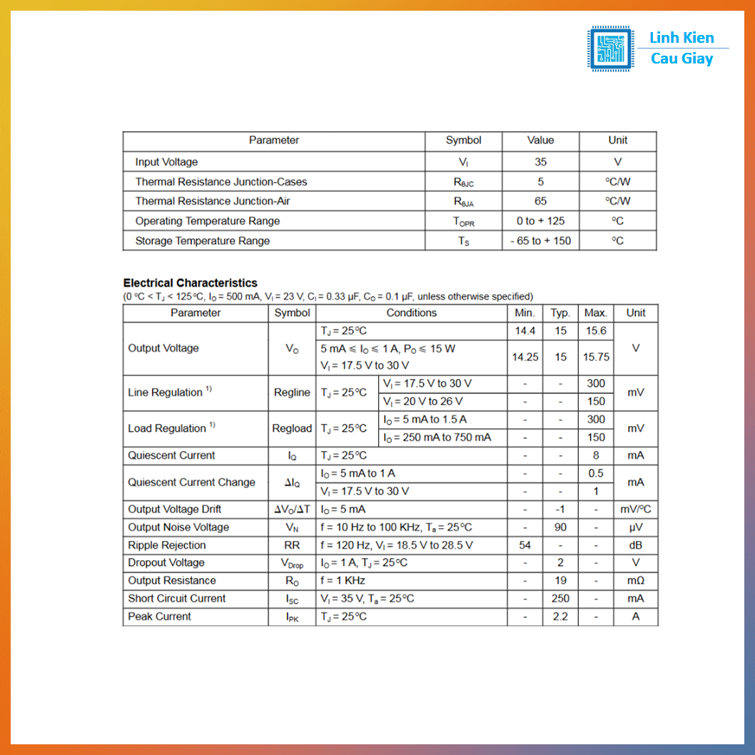 L7815CV là ổn áp tuyến tính cho ra +15V cố định, mạch dùng đơn giản, điện áp ra ổn định và “sạch” phù hợp mạch analog/audio. Khi hạ từ điện áp cao xuống 15V, IC sẽ tỏa nhiệt theo công suất P ≈ (Vin − 15V) × I tải, vì vậy tải càng lớn càng cần tản nhiệt/đổ đồng/ke tản để chạy bền.