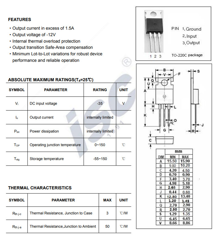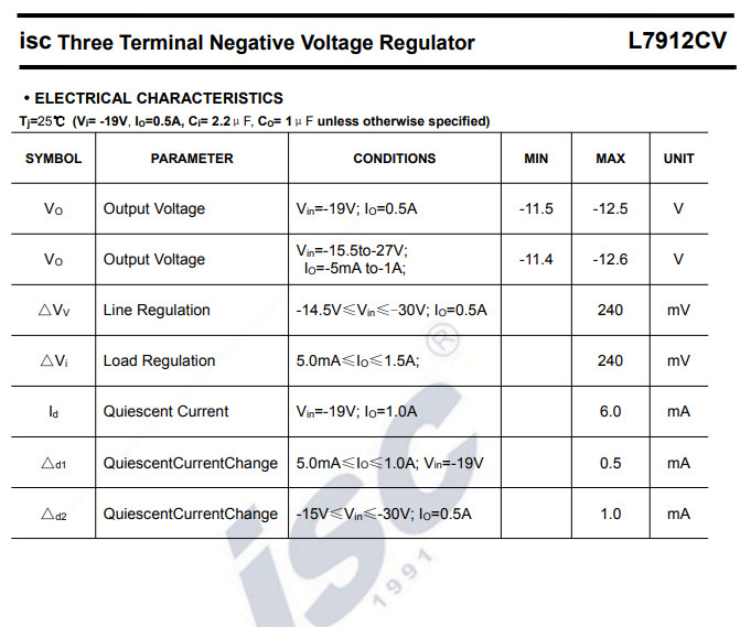 IC ổn áp L7912CV là mạch tích hợp sẵn trong gói TO-220 với một điện áp đầu ra cố định là -12V, yêu cầu điện áp đầu vào cực đại là -35V. IC L7912CV có thế cung cấp điện áp đầu ra với dòng điện lên đến 1A.
