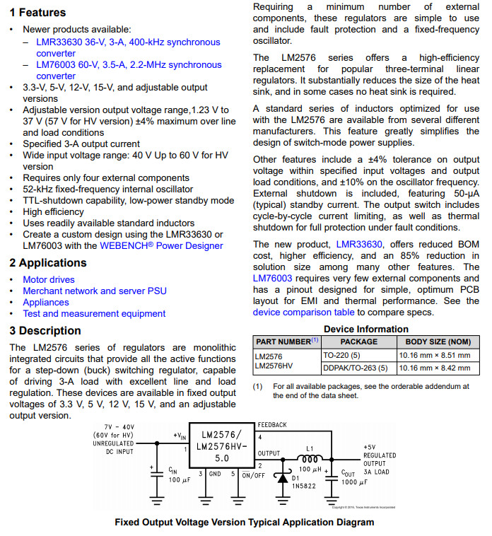 IC LM2576S là IC nguồn tích hợp của mạch nguồn xung dựa trên nguyên lý mạch Buck. LM2576S có nguồn ra tải định mức là 3A, và có các đầu điện áp ra cố định là 3.3V, 5V, 12V và điện áp ra biến đổi tùy theo từng loại của họ LM2576S. Đây là IC làm việc ổn định, đầu ra điện áp ổn định trong điều kiện nhiệt độ cho phép. LM2576S được lựa chọn nhiều trong các ứng dụng về mạch nguồn. Ngoài ưu điểm về dải điện áp áp đầu vào rộng thì LM2576S còn có khả năng cho dòng đầu ra lớn hơn hơn nhiều, lên tới 3A.