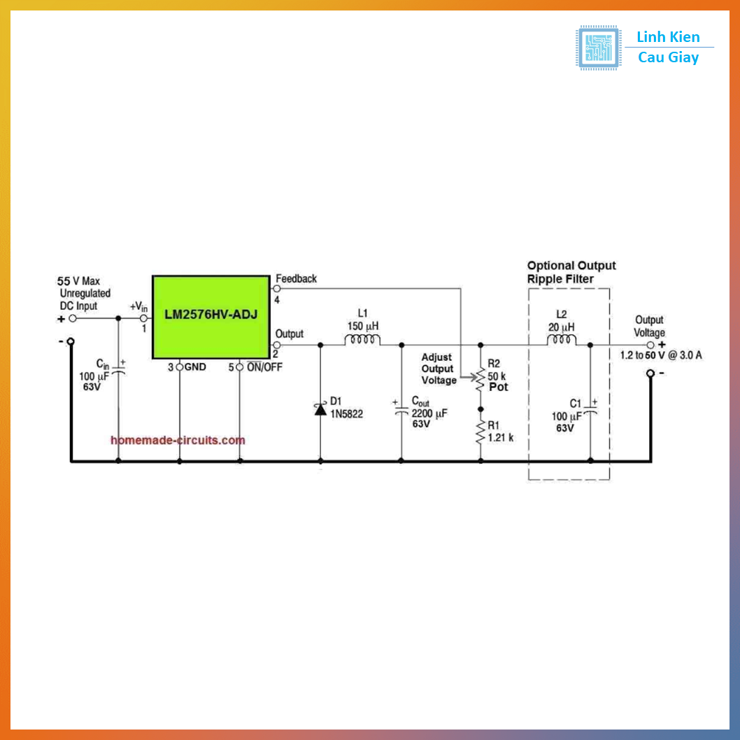 Muốn dùng LM2576S-ADJ phải có linh kiện ngoài: cuộn cảm + diode Schottky + tụ input/output + điện trở chia áp.