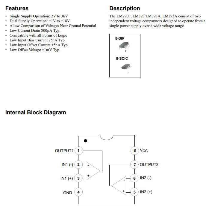 Sê-ri LM393 là bộ so sánh điện áp kép chính xác độc lập với điện áp bù nhỏ cỡ 2.0mV, hoạt động với cả nguồn cấp đơn hoặc nguồn đối xứng. IC LM393 tương thích với cả hai chuẩn TTL và CMOS, được sử dụng nhiều trong các bộ chuyển đổi tương tự – số đơn giản, trong các khối VCO, trong các mạch tạo trễ thời gian, sóng vuông, các mạch dao động và cổng logic số thế cao.