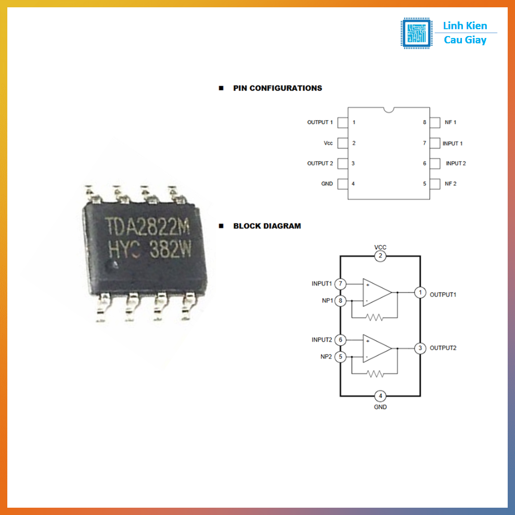Vì có vài biến thể (TDA2822, TDA2822M…), pinout có thể khác nhẹ theo hãng. Pin SOP-8 thường gồm: