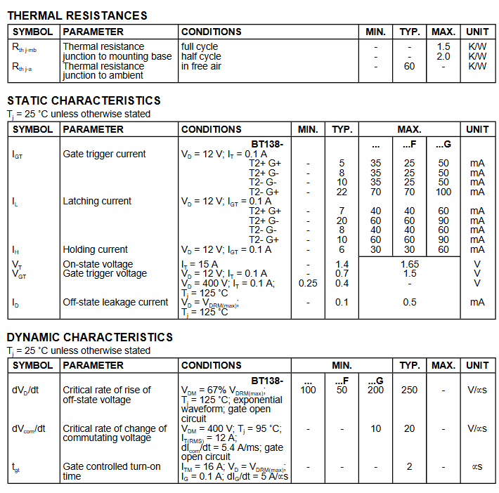 Tối đa 10 mA ở nhiều góc phần tư; góc T2− G+ tối đa 25 mA (tùy điều kiện thử) Điện áp rơi khi dẫn (VT): typ 1.4 V, max 1.65 V (điều kiện datasheet)
