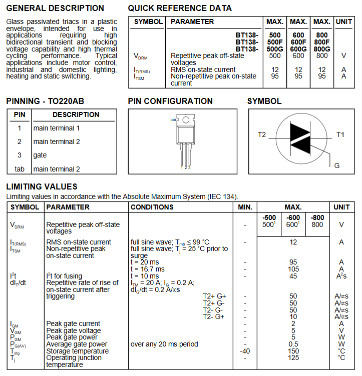 BT138-600E là TRIAC 4-quadrant “sensitive gate” dạng chân cắm TO-220, chuyên dùng để đóng cắt hai chiều và điều khiển pha (phase control) cho tải AC như đèn sợi đốt/halogen, gia nhiệt, motor AC công suất vừa… Thiết kế triac cho phép kích bằng mạch điều khiển công suất thấp (logic/MCU thông qua mạch kích phù hợp), phù hợp làm dimmer, điều tốc, điều khiển nhiệt và các mạch chuyển mạch AC phổ thông.