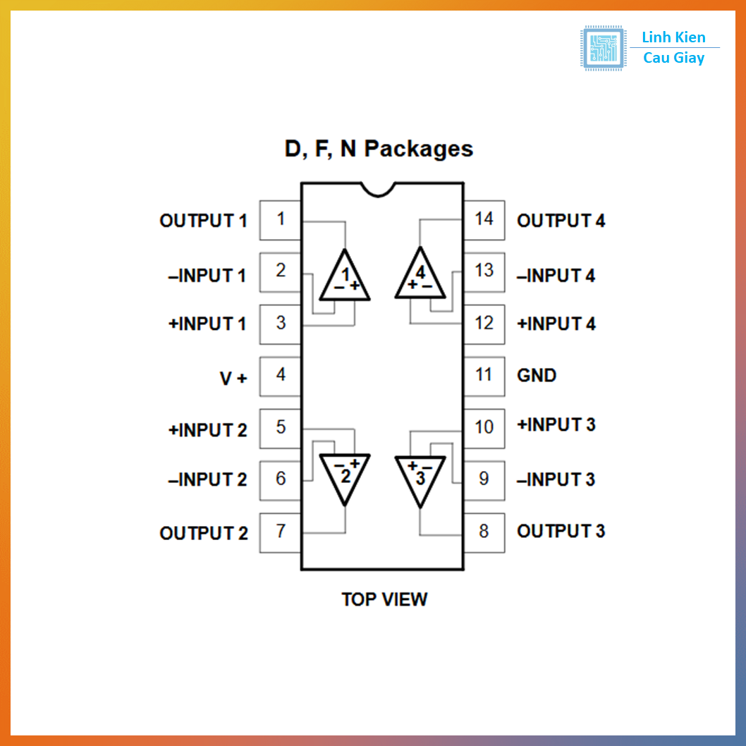 Tổng cộng 14 chân – 4 bộ khuếch đại thuật toán: