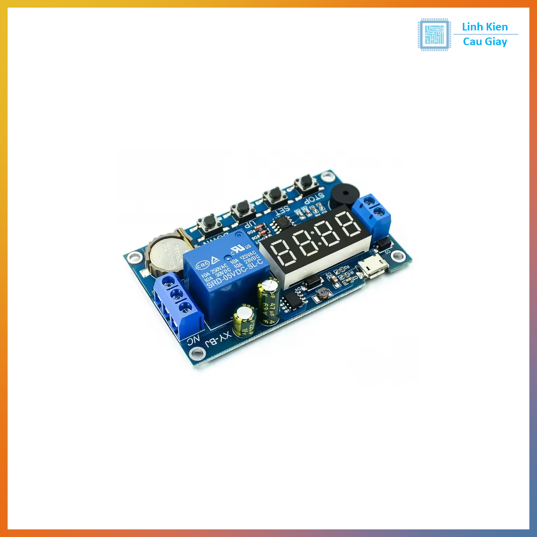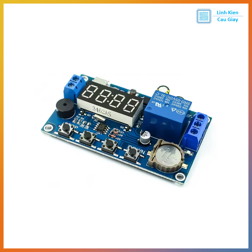 Mạch hẹn giờ dùng RTC có pin nuôi thời gian thực, hiển thị LED 4 số, tích hợp relay 1 kênh 5V. Hỗ trợ nhiều chế độ: hẹn giờ bật, hẹn giờ tắt, lặp theo chu kỳ ngày/giờ/phút, đếm trễ bật/tắt. Cài đặt bằng các nút nhấn ON / SET / STOP, đồng bộ thời gian như đồng hồ điện tử. Phù hợp tự động hóa đơn giản, điều khiển thiết bị theo lịch.