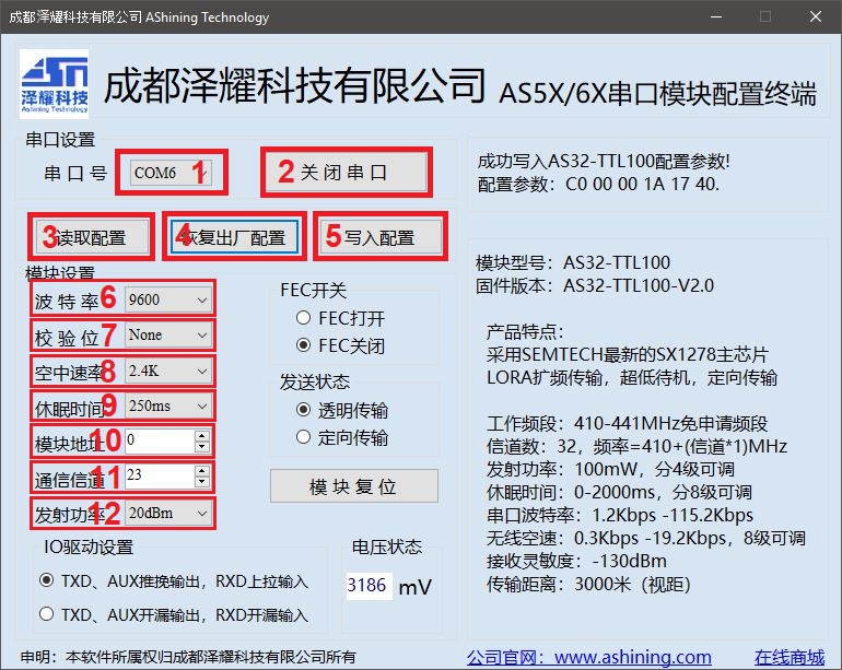 Tiếp theo bạn cài đặt các thông số cho module AS32-TTL-100 và bấm “SetData (5)” để lưu lại cấu hình cài đặt.