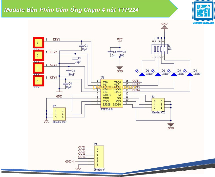 - 4 phím cảm ứng điện dung, tín hiệu tương ứng với 4 ngõ ra.