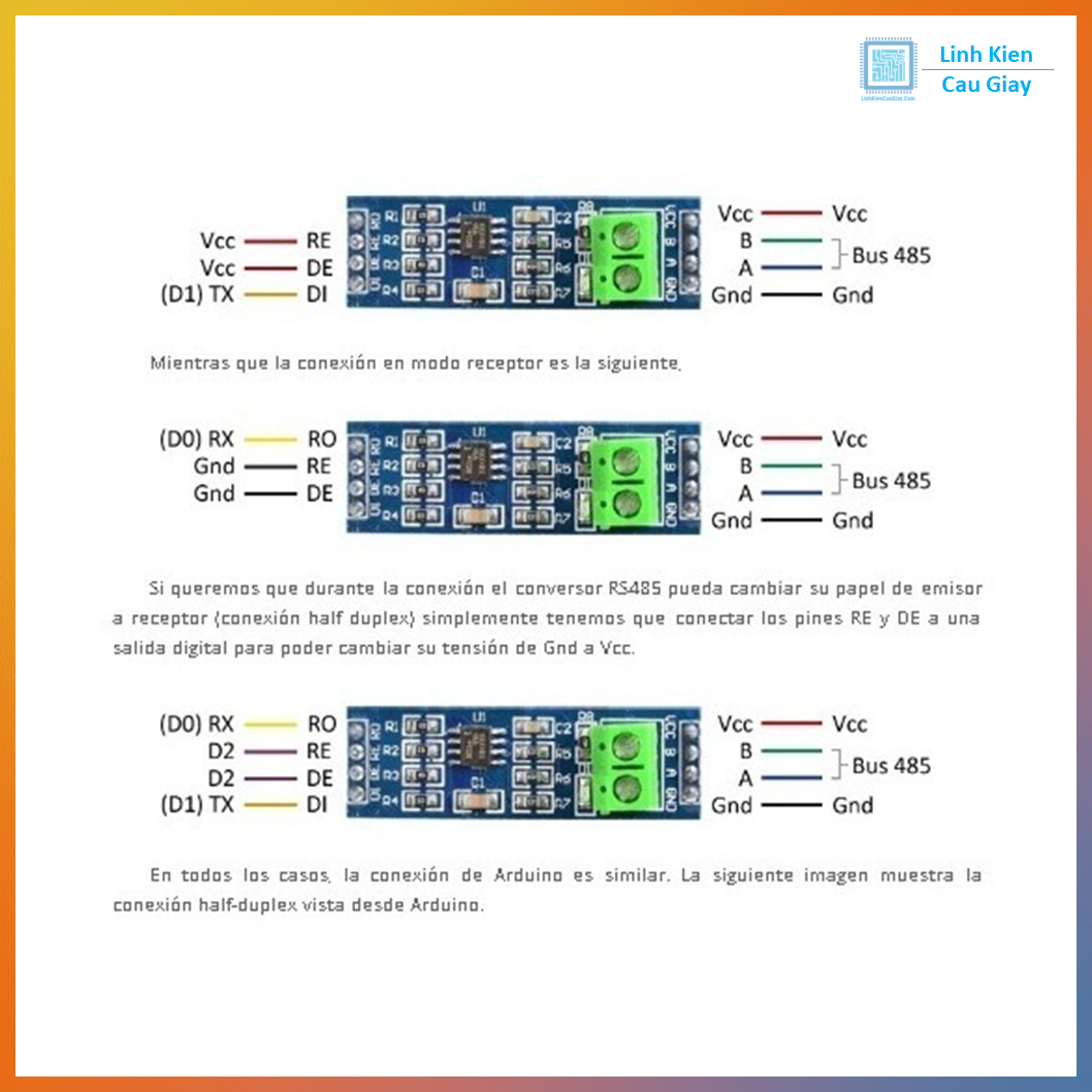 Module nhỏ gọn, dễ sử dụng, chỉ cần cấp nguồn và kết nối chân tín hiệu TTL là có thể chuyển đổi thành tín hiệu RS485 qua cổng A/B. Sản phẩm thường dùng IC MAX485 hoặc SP485, tiêu thụ điện năng thấp và tương thích tốt với nhiều dự án IoT, công nghiệp.