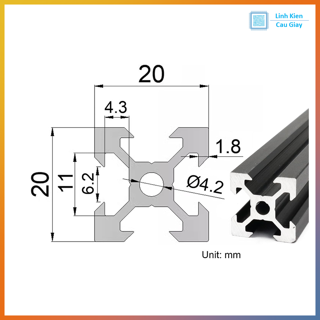 Profile: 2020 (kích thước mặt ngoài 20×20mm)