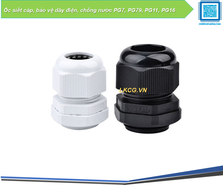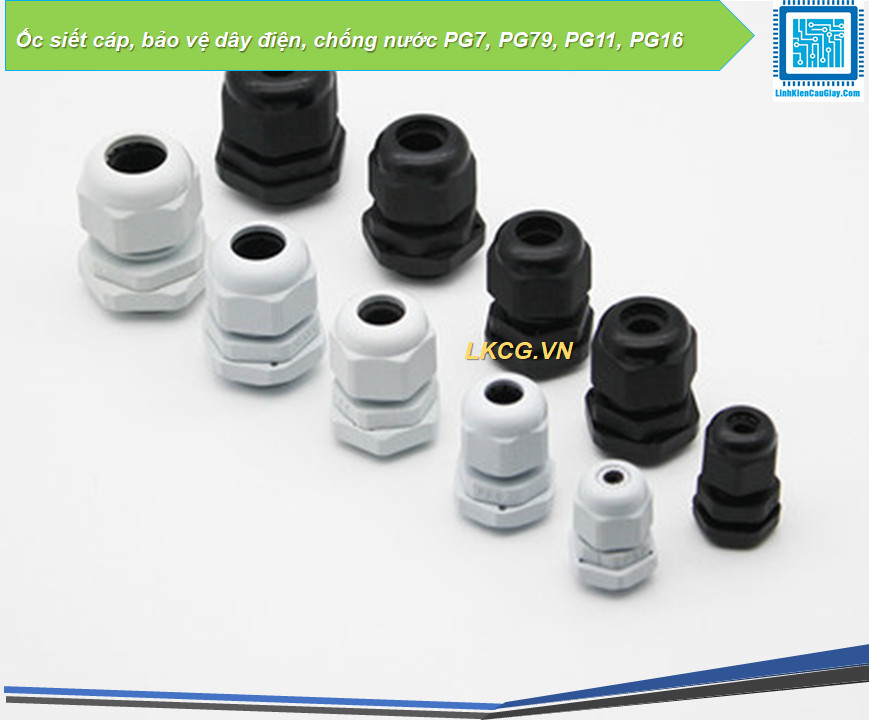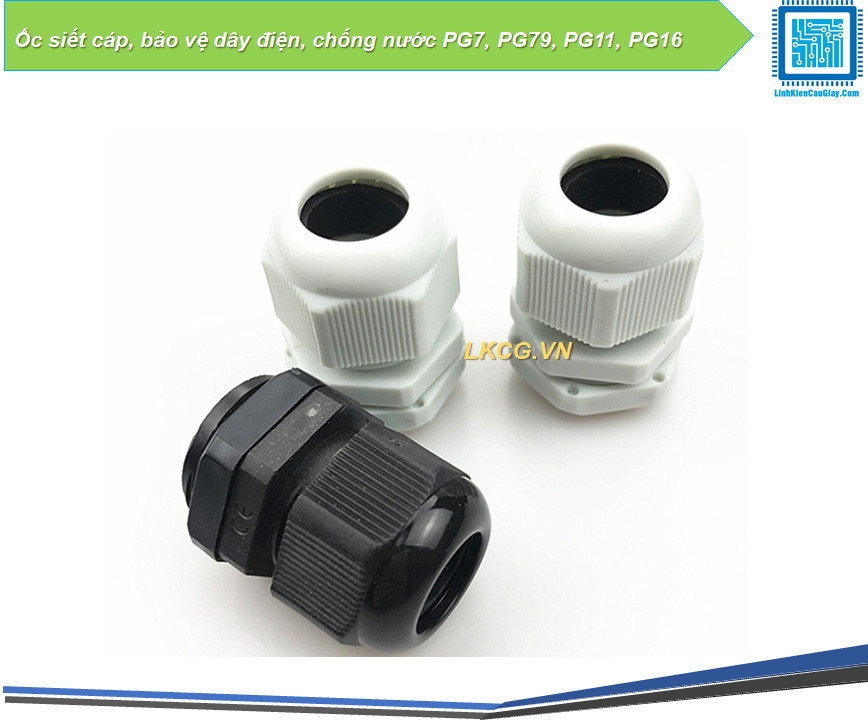 Ốc siết cáp nhựa PG7 PG9 PG11 PG13.5 PG16 PG19 PG21 PG25 PG7: Ốc siết cáp nhựa Ø12, cable 3.5-6mm PG9: Ốc siết cáp nhựa Ø16, cable 4-8mm PG11: Ốc siết cáp nhựa Ø17.9, cable 5-10mm PG13.5: Ốc siết cáp nhựa Ø20.2, cable 6-12mm Màu sắc: đen, trắng
