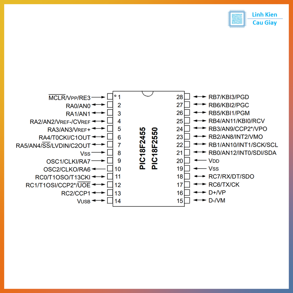 Chip có bộ nhớ 32KB Flash, 2KB SRAM, 256B EEPROM, tốc độ xử lý tối đa 48MHz (PLL). Ngoại vi đa dạng: USB 2.0, UART, SPI, I²C, 10 kênh ADC 10-bit, PWM, Timer, CCP/ECCP, hoạt động ổn định và bền bỉ.
