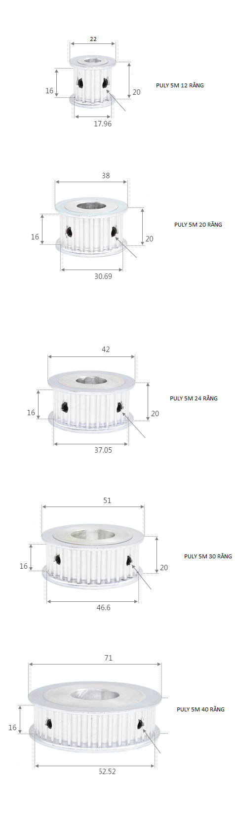 Pulley 5M là sản phẩm bánh răng đai thường được sử dụng trong các ứng dụng chế tạo máy cnc, máy in 3D, máy khắc laser và các loại máy sử dụng cơ chế truyền động đai khác.