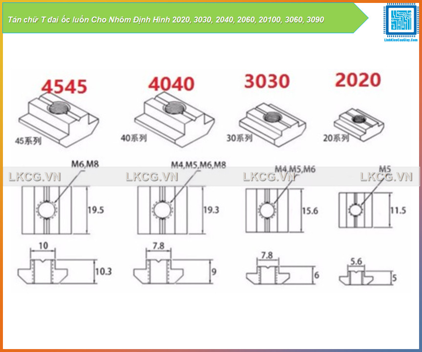 Tán chữ T đai ốc luồn Cho Nhôm Định Hình 2020, 3030, 2040, 2060, 20100, 3060, 3090