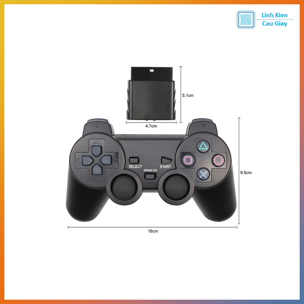 Tay cầm có các nút bấm: L1, L2, R1, R2, SELECT, START, các nút điều hướng D-pad, các phím hình (X, O, □, △) cùng 2 cần analog trái/phải. Sản phẩm có thể truyền tín hiệu không dây ổn định trong khoảng 10–15 mét, rất phù hợp cho các dự án robot và điều khiển từ xa.